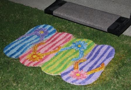 I smile every time I walk in or out of Wertle! We told everyone that we didn’t want or need anything for our rig, especially after ridding ourselves of a ton of unwanted stuff. We did receive a few small things and one of my favorites was from Dana, who insisted on getting something for our new home. It was the perfect gift, a colorful flip-flop doormat. Some of you might know about my shoe collection. During our purging, I was forced (self imposed) to get rid of most of my shoes. The flip-flop mat is a reminder of my favorite kind of shoes and my favorite daughter-in-law, albeit, my only daughter-in-law. It’s not too large so it fits neatly by the front door when we pack up to move. It’s functional, so we can keep dirt out of the rig! And, of course, it’s cute shoes!  What more could a girl want!