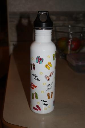 Another gift that I use on a daily basis has a familiar theme. My very thoughtful sister, Elaine, or “E”, as I call her, gave me a very functional water bottle that has a shoe design, all colors and shapes of flip-flops.  It comes with me when I get in the truck for a travel day and on our hikes. She, also, gave me a beautiful, functional, leather bound journal that I have to start using! I’m so lucky to have such a thoughtful sis!
