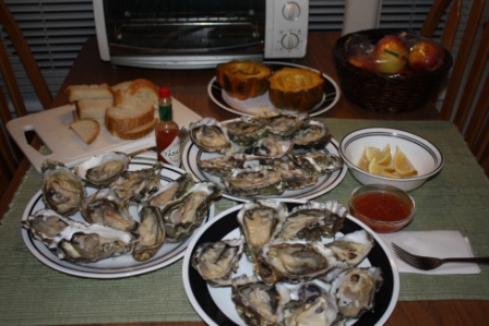 Meanwhile, we also discovered Clausen Oysters in Coos Bay. Harvested daily, $6 per dozen, sweet and tasty! 2 dozen of them became our dinner accompanied by fresh sourdough bread from Reedsport and a fresh acorn squash from just up the road. Yummy! Oh yeah, forgot to mention that our neighbors, who have a boat and 3 large crab pots, pulled their pots this morning and had 60 keeper Dungeness. They graciously contributed 3 of those bad boys to our stash, and we will very likely dine on them tomorrow! We did trade them the location of Clausen’s, so it worked out pretty even.