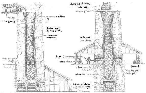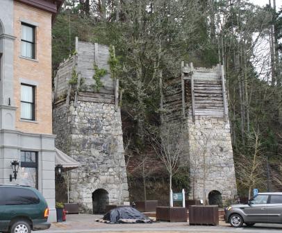 Large chunks of wood, mostly clear cut from nearby islands and then barged over to the kiln site, would be loaded into the burn box at the bottom and the fire would generate up to 2800F, hot enough to burn the rock down to a sooty powder we know as lime. It was primarily used to make concrete or to put on crops. There was a man named John McMillin who made an enormous amount of money when he founded Roche Harbor (on San Juan Island) as a “company store” town which operated his lime kilns 24 hours a day, paying the workers in “scrip” that was redeemable at the company store and for paying rent in the company bungalows. We sometimes think OUR jobs are tough, but there were 100’s of men who worked up to 16 hours a day lifting and moving 100 lb. sacks of lime, and they didn’t even get paid in cash!