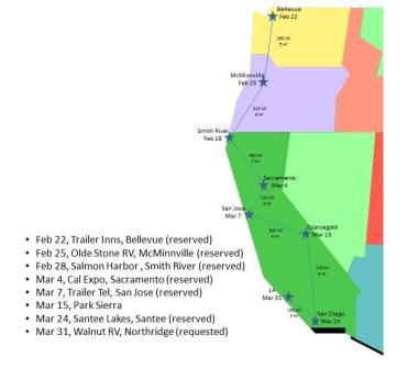 We plan to stay through the President’s Day weekend, then we’re off back to the mainland to begin our migration south. We plan to spend the month of April in the LA area to visit with family prior to our drive east for the remainder of the year. And here is a map of our planned itinerary to get there, for those of you who might wonder where we will be passing through, and when that will be. Remember, this is the PLAN, no guarantees!
