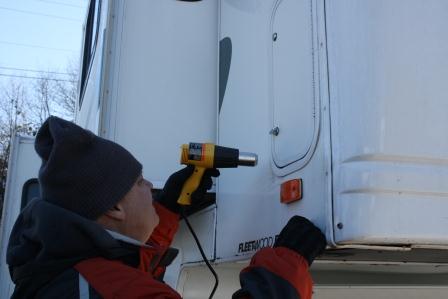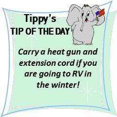 Thursday dawned clear but cold. Clear is good because the sun melts the snow on the roads quickly. Cold is not because it freezes the stuff the sun doesn’t reach. So let’s get back to the Titanic part (I know you are dying to hear). On Friday we were scheduled to transit to McMinnville Oregon. From the INSIDE of the rig, everything looked dandy. Sunny, clear, roads plowed and looking dry. So let’s get ready and go! At 9AM I started the prep work outside to pack up, only to discover that the snow banks on the top of our slide-out rooms were really icebergs, and they had to be removed before folding up the rig. 2 hours later, me shoveling and chipping from the outside (has anyone seen The Deadliest Catch on The Discovery Channel where they crack the ice off of the boat with sledge hammers?), and Wendy using a spatula to remove the parts that managed to slip inside. So here we are chipping our rig out of an iceberg, or thawing it with a heat gun, and freezing in the process.