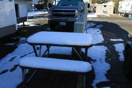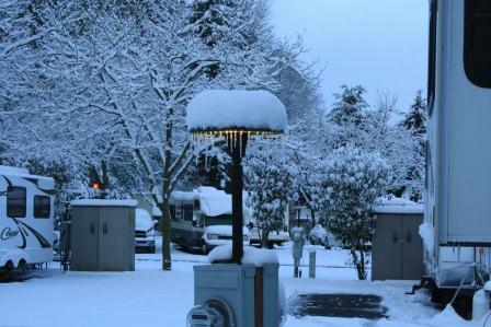 The Titanic thought IT had problems! We spent 3 days in Bellevue Washington on our way back south to visit with family. The first day, Tuesday, was a short travel day (mileage wise that is) from Orcas Island to Bellevue. We drove 5 miles to the ferry landing, spent 2 hours in line, drove 1 minute onto the ferry, sailed for 1 hour, drove 15 miles to Costco Gas, then added another 75 miles to get to Bellevue. Setup was a little chilly, but we got ‘er done. Wednesday we had a little snow in the morning, just enough to create an art deco Tiffany lamp atop the utility pedestal in our camping spot.