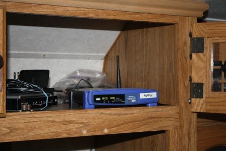 I acquired our kit from JefaTech (www.jefatech.com), who assembles and customizes off-shelf equipment to create a complete set ready to install. Ours came with a customized Linksys Wireless G router (it also has 4 hard wire ports), custom firmware to make it super easy to use and configure, an 8 dB high-gain antenna (they offer an even larger one if you want), 20 feet of high quality coax cable (you can order in any length you need), and a mounting kit to put the high-gain antenna onto the outside of the rig for best signal reception. I took a tip from the JefaTech user forum and decided to mount the antenna onto our existing crank-up TV batwing antenna. By doing this I can raise the antenna up so that it reaches 18 feet above ground for great long distance signal reception. I’m actually able to “see” wireless access point signals more than ¼ mile away, so if we’re parked near a Starbucks, we get free internet!