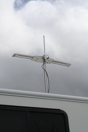 By using the batwing for our mount, I was also able to route the coax cable into the rig using the existing waterproof boot for the TV antenna cable. Not having to “breach the hull” was a relief as this almost ALWAYS creates a leak point. And with the winter we had, and the spring we are having, a leak is the last thing I want. A little routing of the cable inside the rig took it to a convenient shelf near our equipment. Note: JefaTech recommends having the router, which still has a single rubber duck antenna, relatively close to the external mast so they two antennas can “see” each other’s signals. Our two antennas are almost line-of-sight through our forward vent hatch.