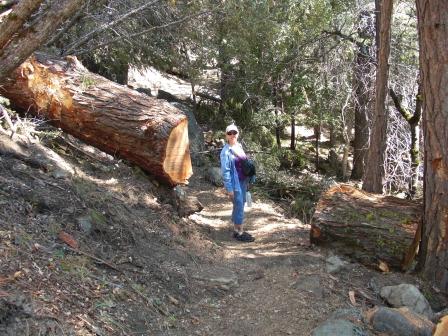 There was a lot of evidence of some of the big winter storms. Wendy stands in the gap cut through a big redwood that fell over the trail. The fresh cut redwood smelled great!