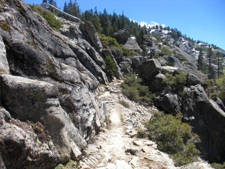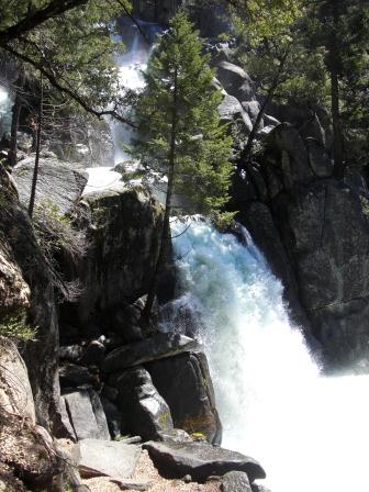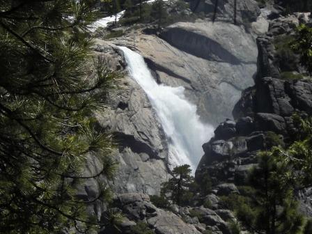Elaine, Robert, Julie and I could go off and explore without a worry. There were swings, the river, lots of pine cones and it was always a thrill to see the first deer show up at our door…usually as dad was tending the barbeque. Before shuttles came to be, we actually drove to Yosemite and all around the valley making many stops to see the waterfalls and check out the water levels. In September the water levels were so low we could wade in the river.  Oops, I seem to have gotten myself back to another time – where was I going with this?  Oh yeah, the hike. I don’t know how he did it but dad managed to talk all of us into going on this very long hike to see a waterfall. Fifty some years ago I just remember being hot, tired and going back and forth on this very steep trail to get to some small pools of water at the very top. When I mentioned the hike to Warren, my thought was that I wanted to see if the hike was every bit as difficult as I remembered. Our spirit was good as we started the steep assent on this beautiful spring day but the ol’ bods took a mighty beating from this very strenuous trail. I didn’t remember the hike as it was but that’s because the beginning was very different with the amount of water we heard, saw and felt as cooling mist… and the granite staircases – so many steps! My sister, Elaine, confirmed that there were no granite stairs when we hiked years ago. We started the 8.2 mile hike at 11:15.