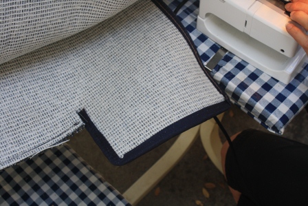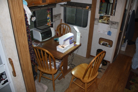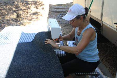 The carpeting in the dining area has one exposed and finished edge since it is in the slide that moves in when retracted. So we wanted to have a nice finished edge there on the new carpet as well. We elected to buy a large area rug (Walmart, $79) that was the texture and color we wanted, and we cut pieces out of it to do our carpeting job. In this way we were able to preserve the finished edge. Wendy made some adjustments after we cut it to fit on the small “wings” at the sides that lap around the wall of the slide. She cut the binding loose from the rug before we cut it to fit, and then sewed that same binding back around the exposed edges.
