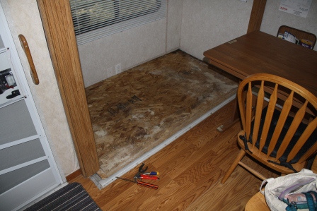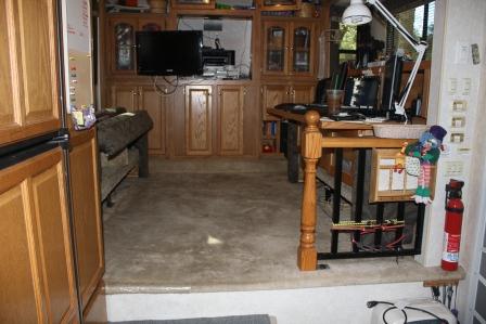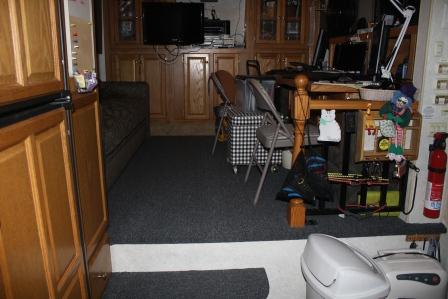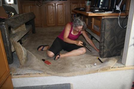 As part of our floor refurbishing in the rig we decided to replace the old carpeting in the dining area and our upstairs lounge, which functions as our office. The rig is 7 years old this year, and the original carpet is cut-pile beige, or at least it USED to be beige. We lifted up an edge that had been doubled over and it isn’t even CLOSE to its original color. We had originally thought to replace the lounge area carpet with vinyl, but the removal and reinstallation started to look way too complex, and so we compromised on some nice tight loop “office” quality carpeting.