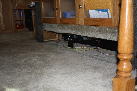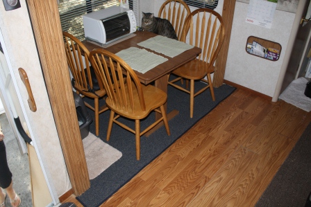 Carpeting the dining area was a snap. It’s pretty much a rectangle, and the table removes with just 2 screws (Note: there are round wooden plugs concealing the screws, use a small screw tapped into the plug to pull them out).
