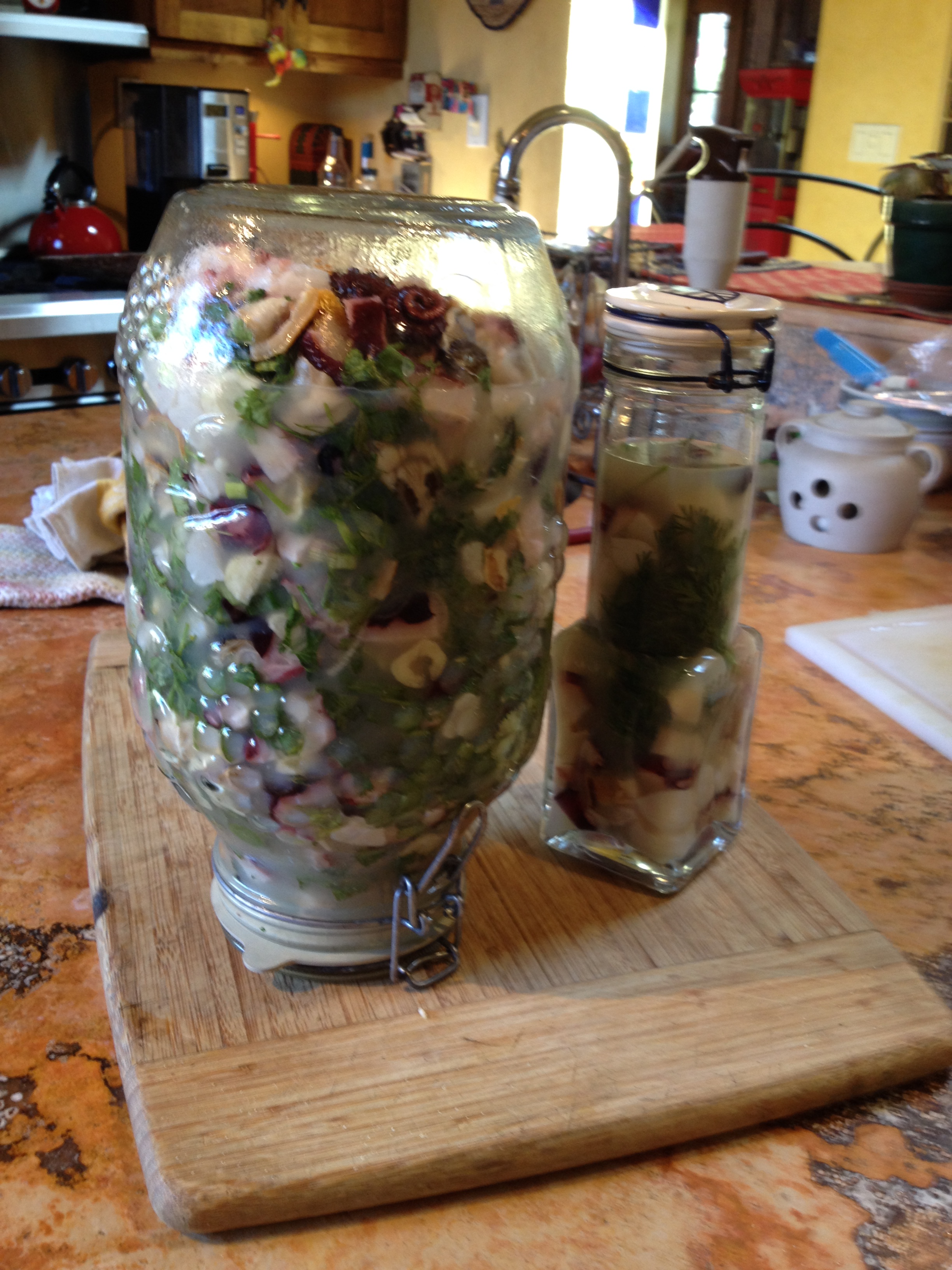 Every ceviche needs spice and lime juice. Bro-In-Law Jeff had about 6 dozen Mexican Limes juiced and frozen, so we appropriated 2 quarts of that lovely nectar. And Wally and Wendy found cilantro, dill, and 2 types of scallions in Wally’s garden.