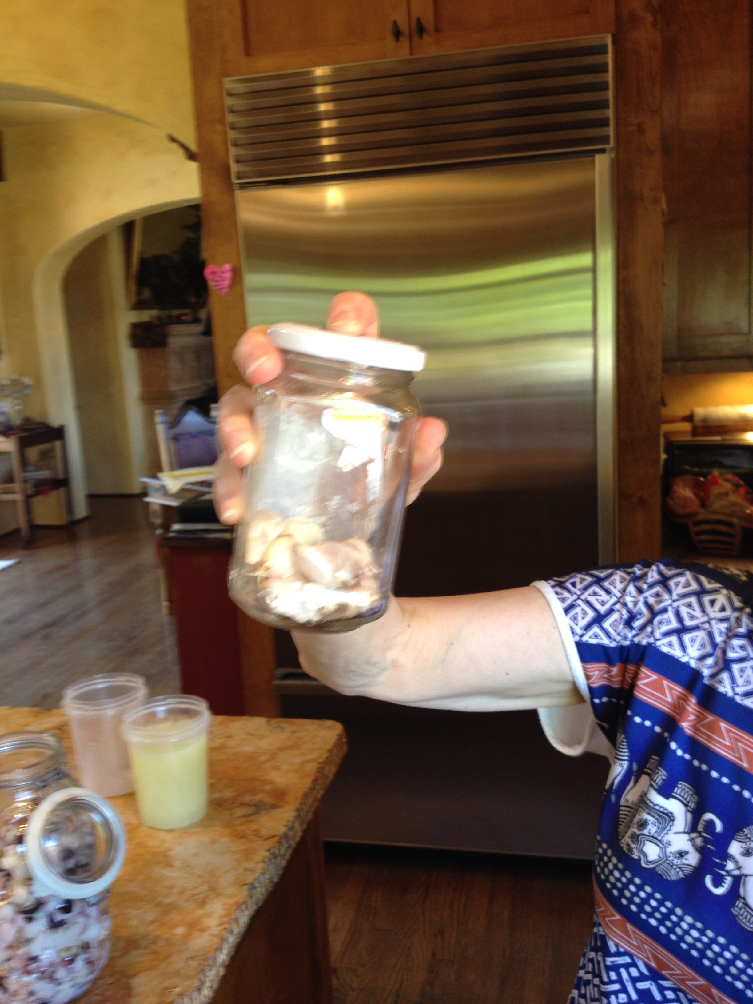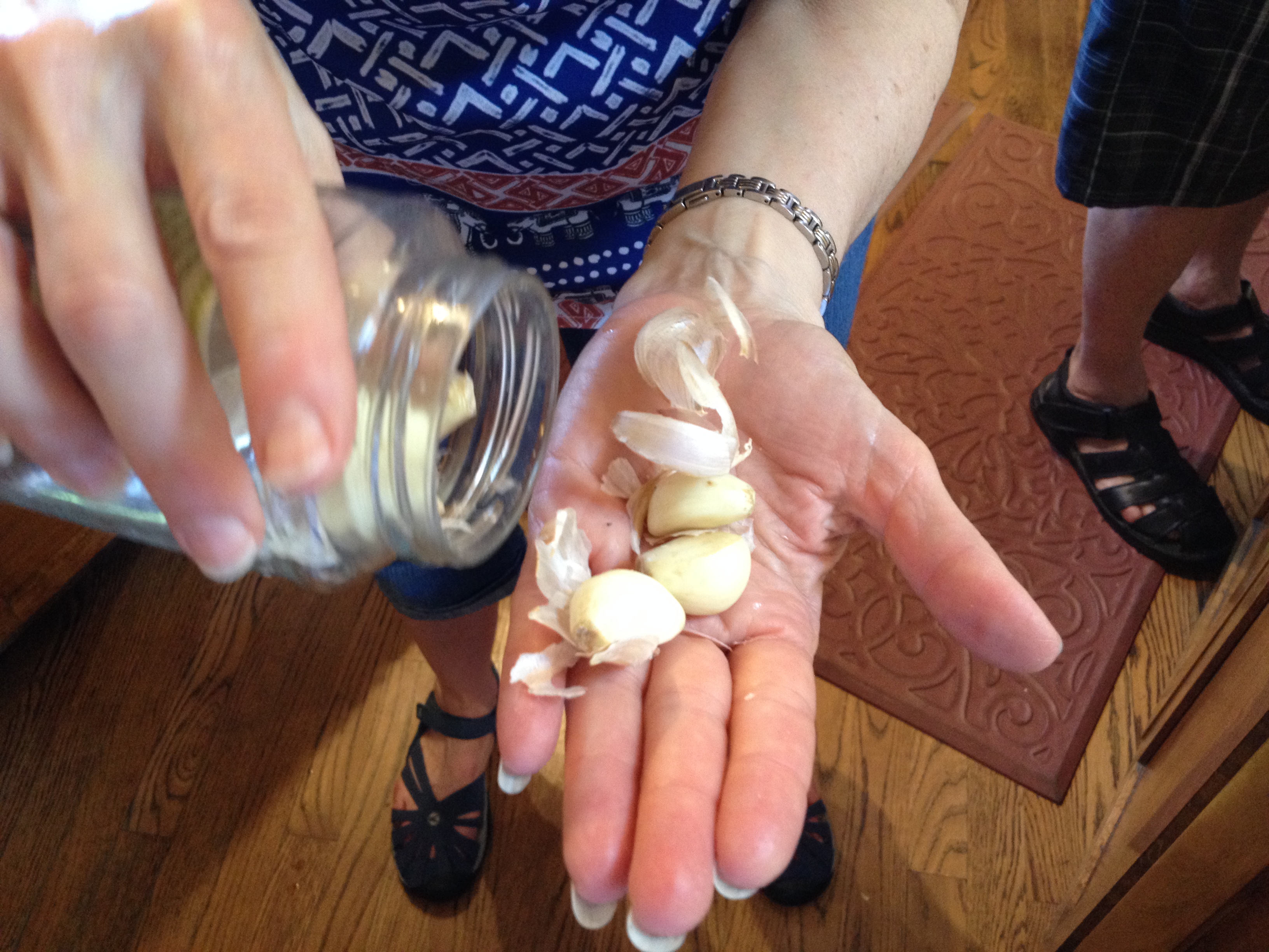 The garlic is best when it’s peeled (or husked) and sliced thin. And for this we were given a wonderful tip from Frankie, Wally’s better half. This really is only good if you are husking a lot of garlic cloves, especially if you are slicing and not mincing them. Separate your garlic cloves from the bulb, and place them into a mason jar or other sealed jar. Shake them vigorously and, voila!, they magically husk themselves!