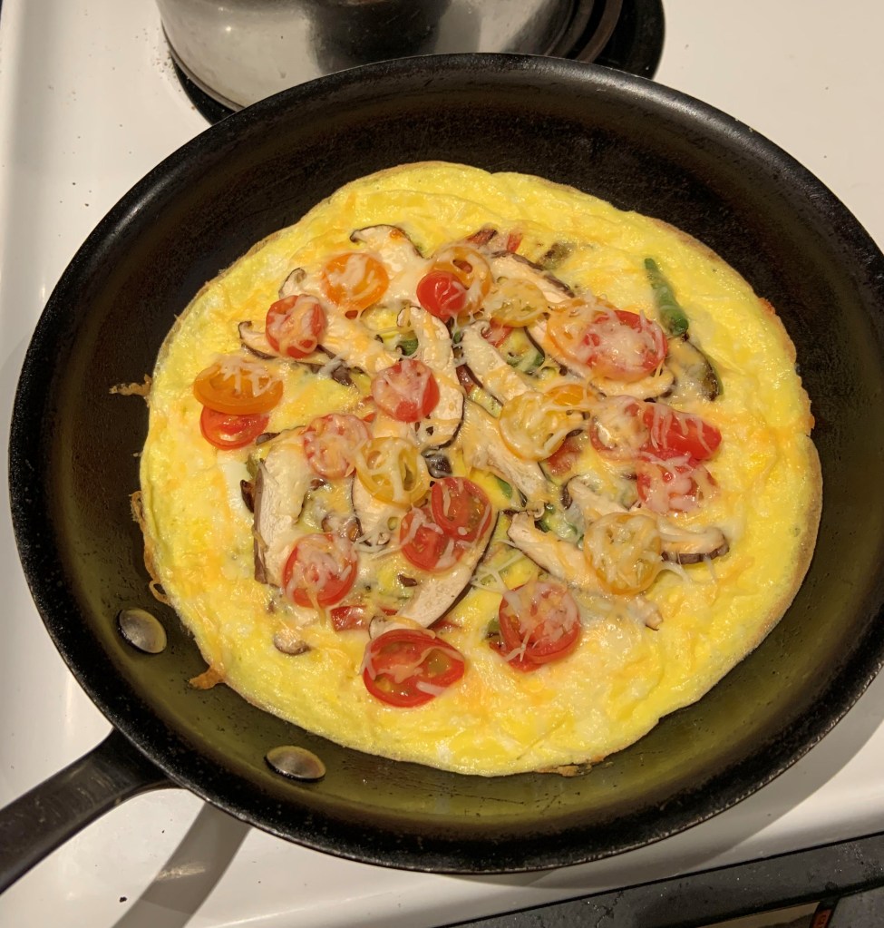Eat well. Make it more fun by challenging yourselves to use everything in your fridge and cupboards. Example: breakfast at Grampa’s Cafe today – a Frittata.