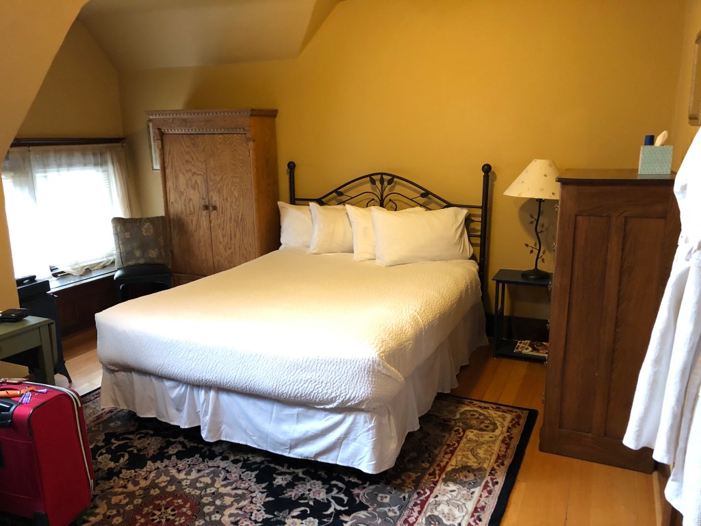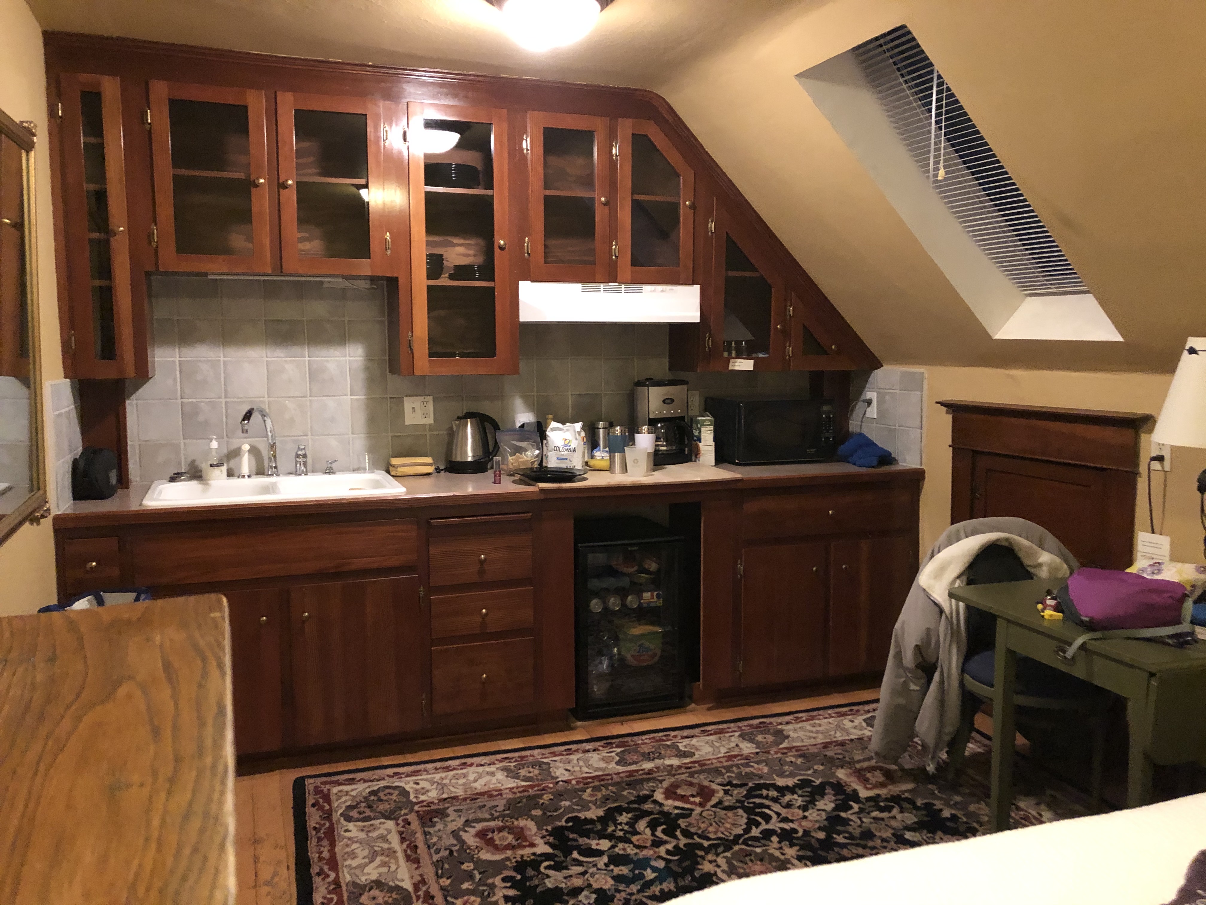 The whole place is furnished in period pieces and replicas to give it the same feel as when it was young. The owners, Bob and Kris, have done a fabulous job capturing the era, creaky stairs and all. There are only 7 suites, each with a private bath. Our room, on the third floor, had a “detached” private bath across the hall, but it compensated for that with a very generous “kitchenette”, just perfect for our 3 night stay.