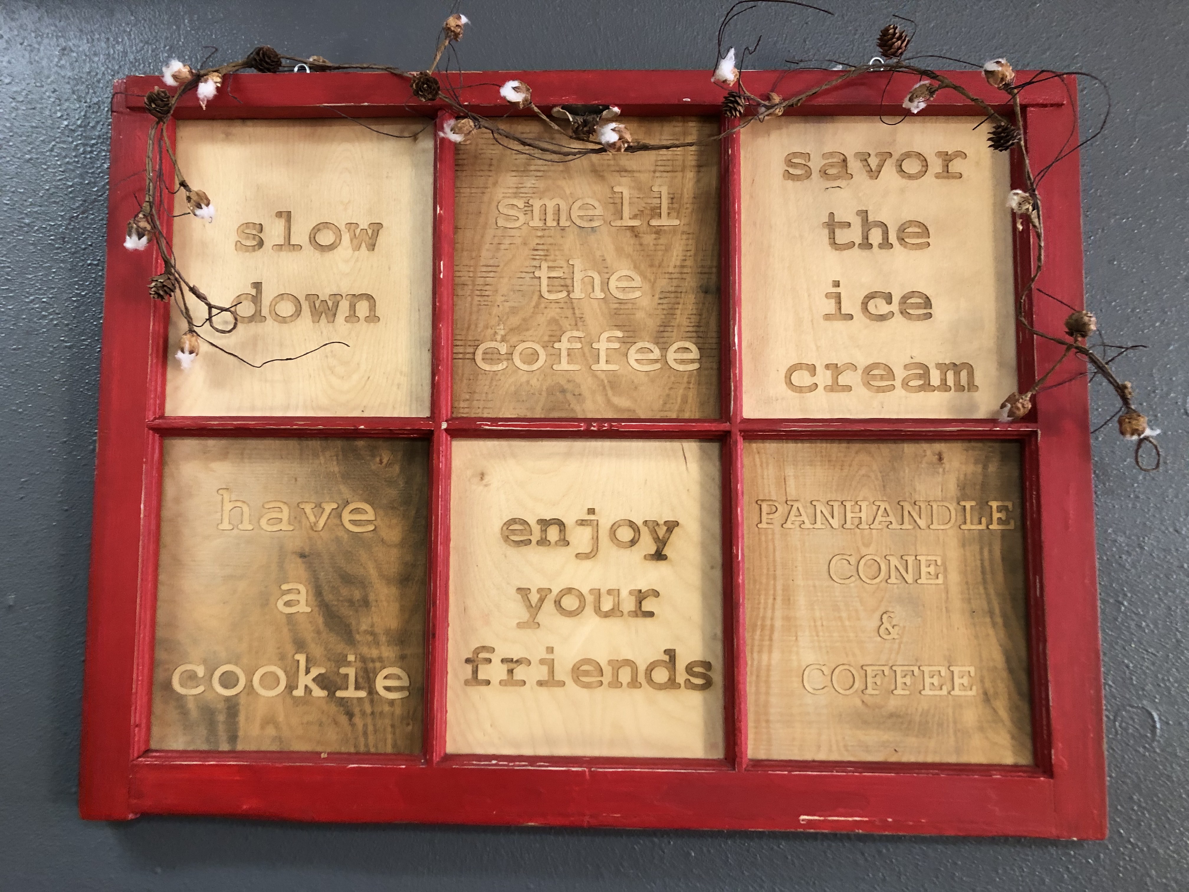 The next day we met our friends Mike and Lisa for breakfast. I’ve known Lisa through past employment for almost 20 years, but have only been in touch through social media. They are taking advantage of “the opportunity of our lives” to live remotely in Coeur D’Alene for a year, and had given us an invitation to visit if we ever got out that way (another good reason to go). They used to live and work in the San Francisco Bay Area, and when Lisa got the OK to work remotely, they flew the coop on a trial run to Living in America. Good for them! We wish them all the best, and will definitely be back to visit. After breakfast, we saddled back up and took a drive one hour north to Sandpoint, which sits on the shores of Pend Orielle Lake. It’s absolutely gorgeous, but felt too far away from civilization for us. We did, however, like the Panhandle Cone & Coffee Company, with some totally delish homemade ice cream. Eggnog and Chocolate Chip Cookie for me, Buttermilk Huckleberry for Wendy. Beside the ice cream, they had a sign in their shop that really summed up our trip.