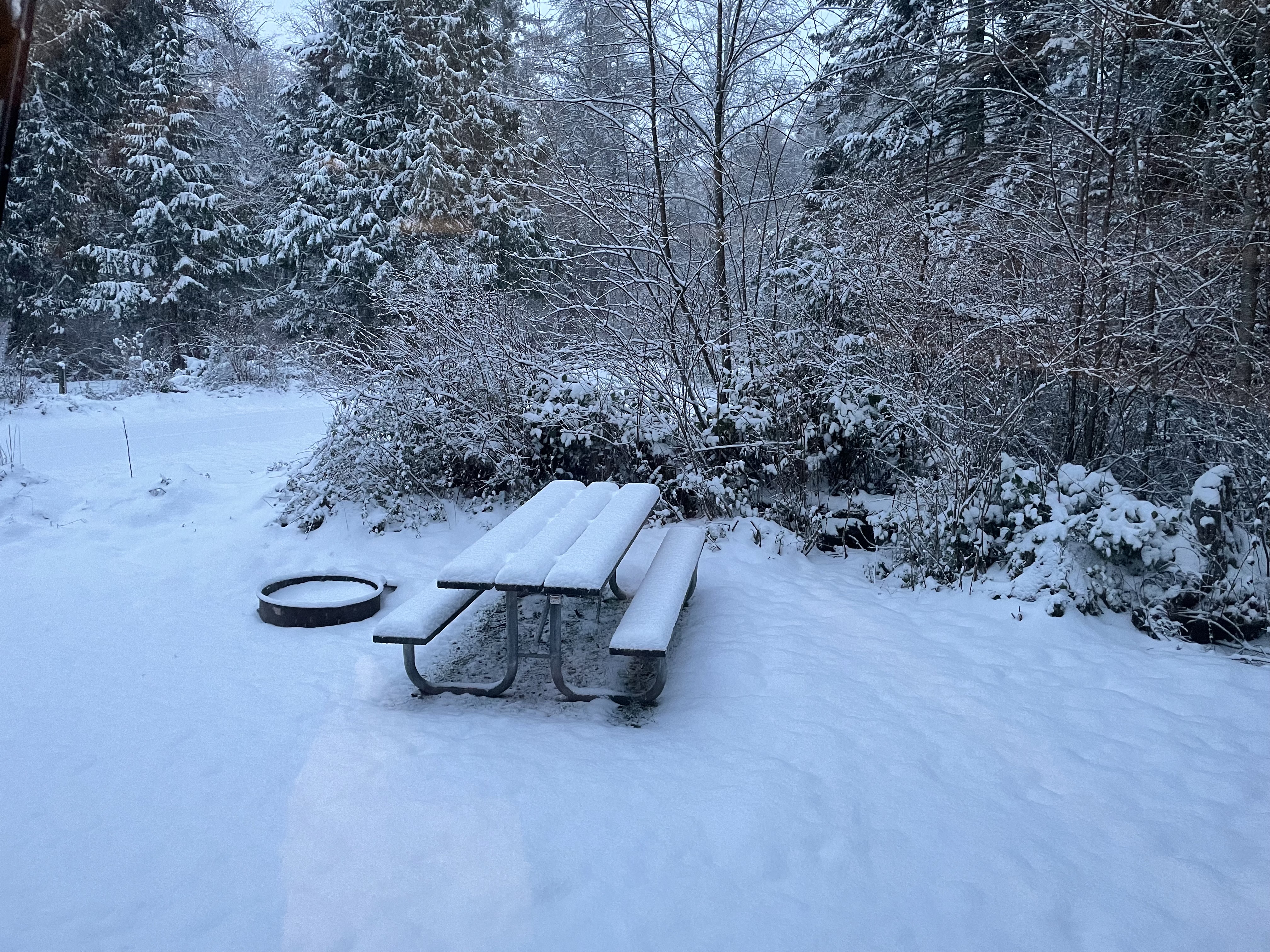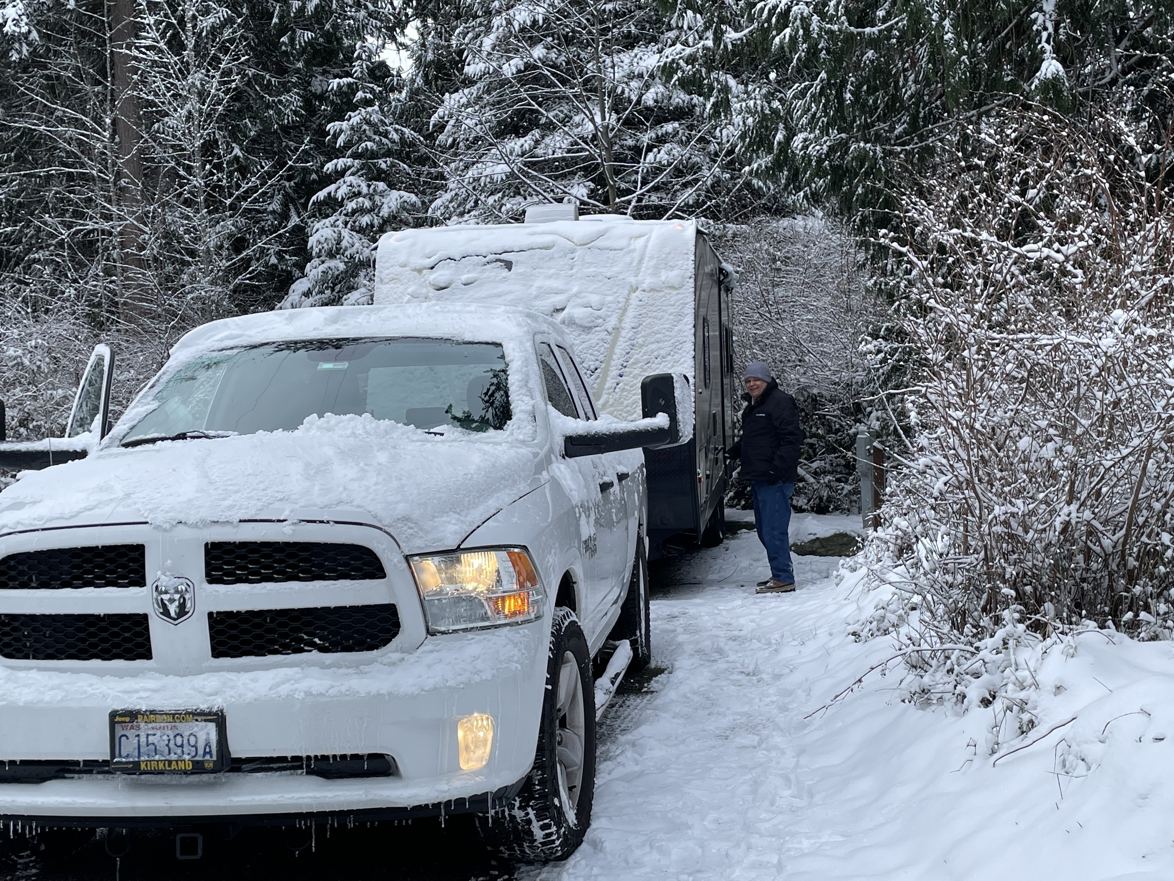 But enough about next year. How about last weekend? For Christmas, we decided to find a nice destination for a trip with the trailer. We had been watching the weather and planning a 2-day trailer camping trip to Deception Pass State Park for Christmas day. It was forecasting “snow showers” and temps in the high 20’s, and we figured that wasn’t too bad, so off we went at noon on Christmas Day. We got set up in the campground with some flakes swirling, but no accumulation, and were very cozy all night. We both got an amazing night’s sleep because it was s o o o quiet. There were very few campers, to be expected. And we got a few snow showers, as we also expected. All very pleasant.