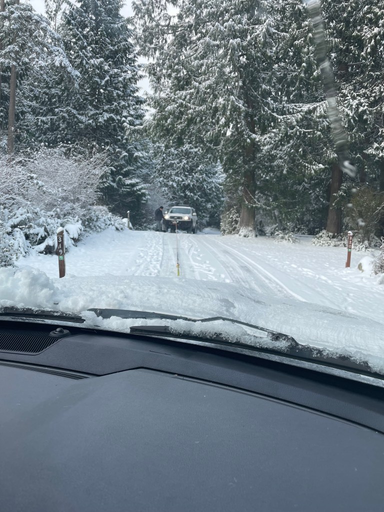 I called one tow company on Whidbey Island, and the person who answered the phone (!!) said it would be at least 6-7 hours before they could respond. We called AAA, and waited 30 minutes for an operator, who, after 20 minutes of checking this and that, told us they couldn’t do anything for us. Just as that call was winding up, a camper who was one of the Very Few, walked up and tapped on the window. He had a truck, and a winch, and might be able to help. Since we were blocking the one-way road around the campground, he went the other way around, parked just over the top of the hill facing us, and unwound his winch line toward us. It came up 15 feet short.