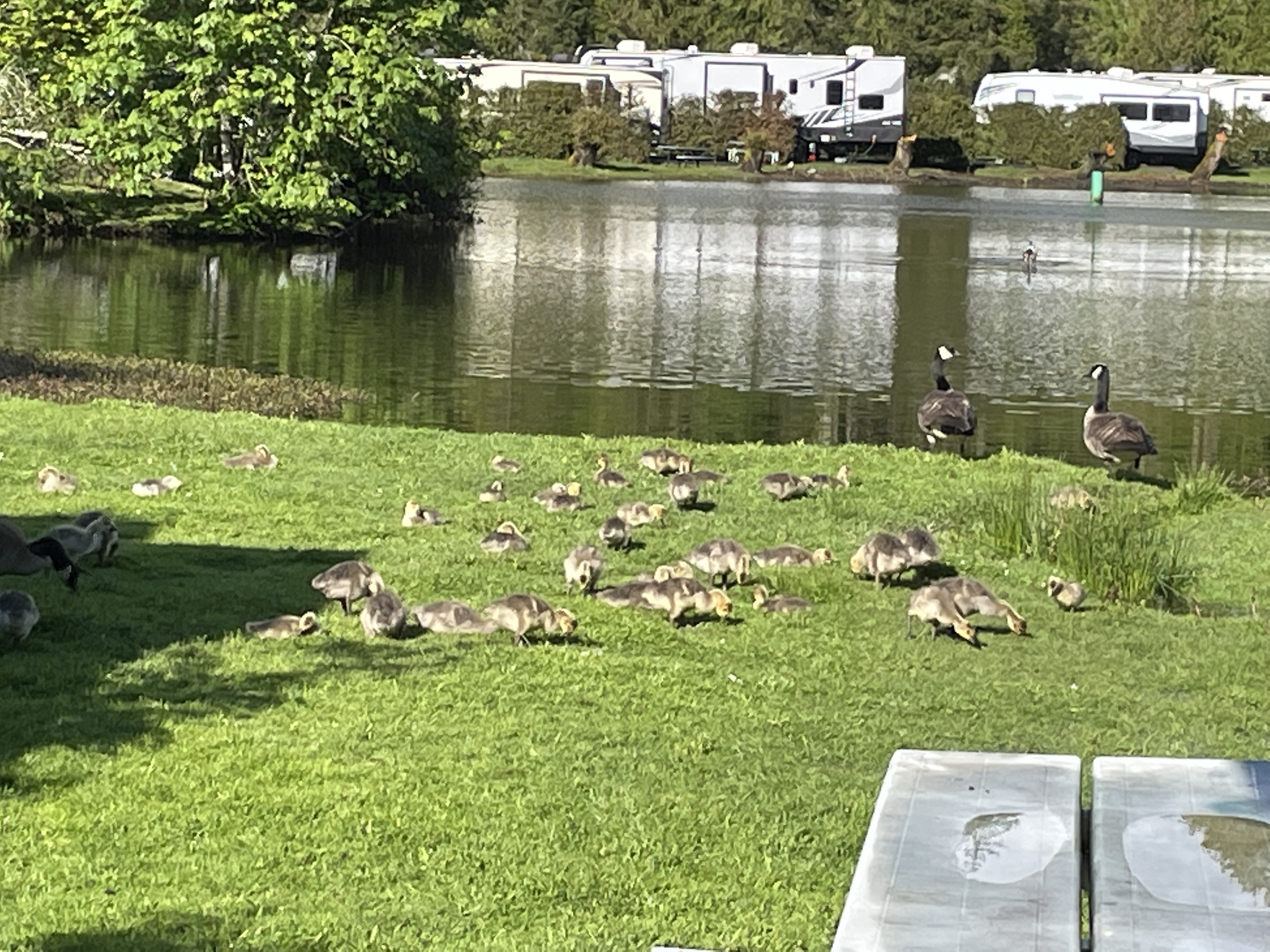 where our lives were dominated by the geese. We were visited daily, right about dinner time, by 3 adults that escorted 35 babies of graduated ages from tiny hatchlings to gawky “teenagers” that would be ready to start stretching and trying their wings within a couple of weeks.