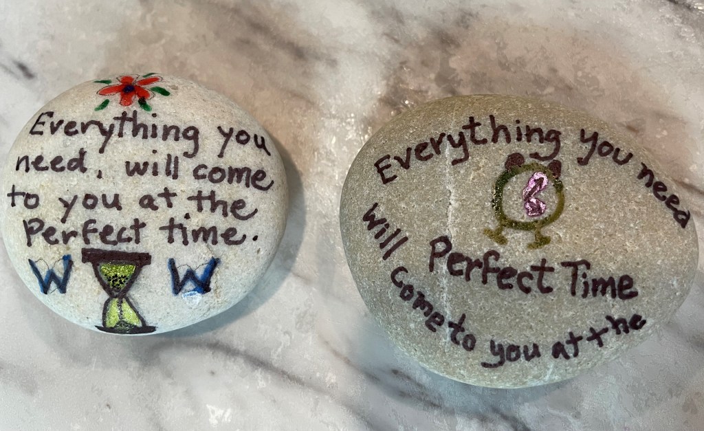 Wendy came up with a great idea to help us pass the time, and to commemorate our BTE. At every stop, and on every day, we will paint and inscribe a pair of smooth rocks with the same quotation (she has a massive list), resulting in what we call “the twins”. One will be inscribed on the reverse with the date, the location, and our blog address; the other will be inscribed with the date, location, and name of the RV park. We’re planning on putting the twin inscribed with our blog address either in our RV campsite, or somewhere along the road when we make a stop. The other will go into our new garden in Florida. We’re hoping that some of the finders will tune into the blog and leave a comment about finding the rock.