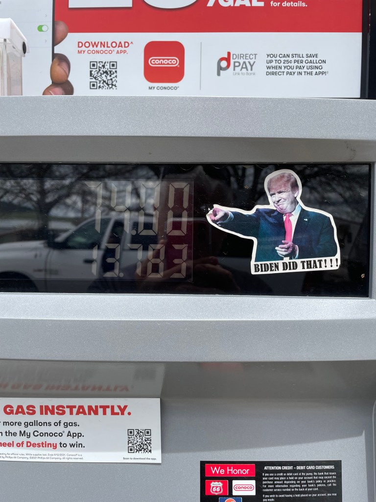 It is political campaign season, and the billboards and yard signs all reminded us we are in a very very conservative part of the country. We stopped for gas, and every pump had one of these on it.