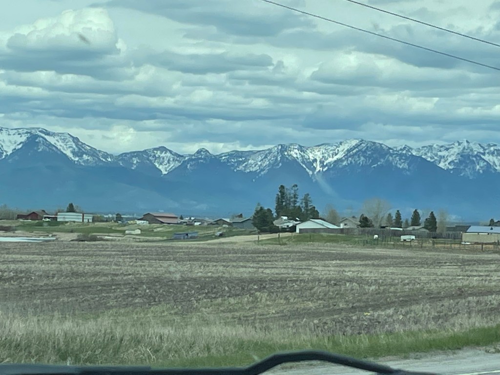 The drive to West Glacier, Montana was pleasant and scenic. Mountains, more mountains, and yet more mountains, then a very long valley full of mostly cows and lakes. Those are the Rockies in the distance, and yes, we will have to find a way over them at some point.