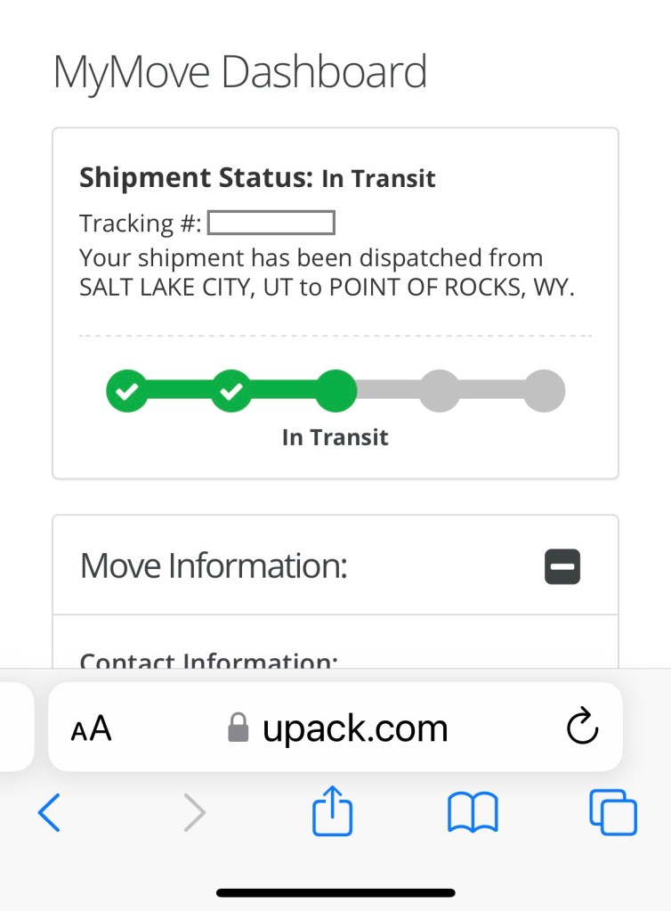 We’ve been tracking our moving van across the country. We’re sure you all will be happy to hear that it was in Point of Rocks, Wyoming at last report. (Note to Editor: Point of Rocks? Really?)