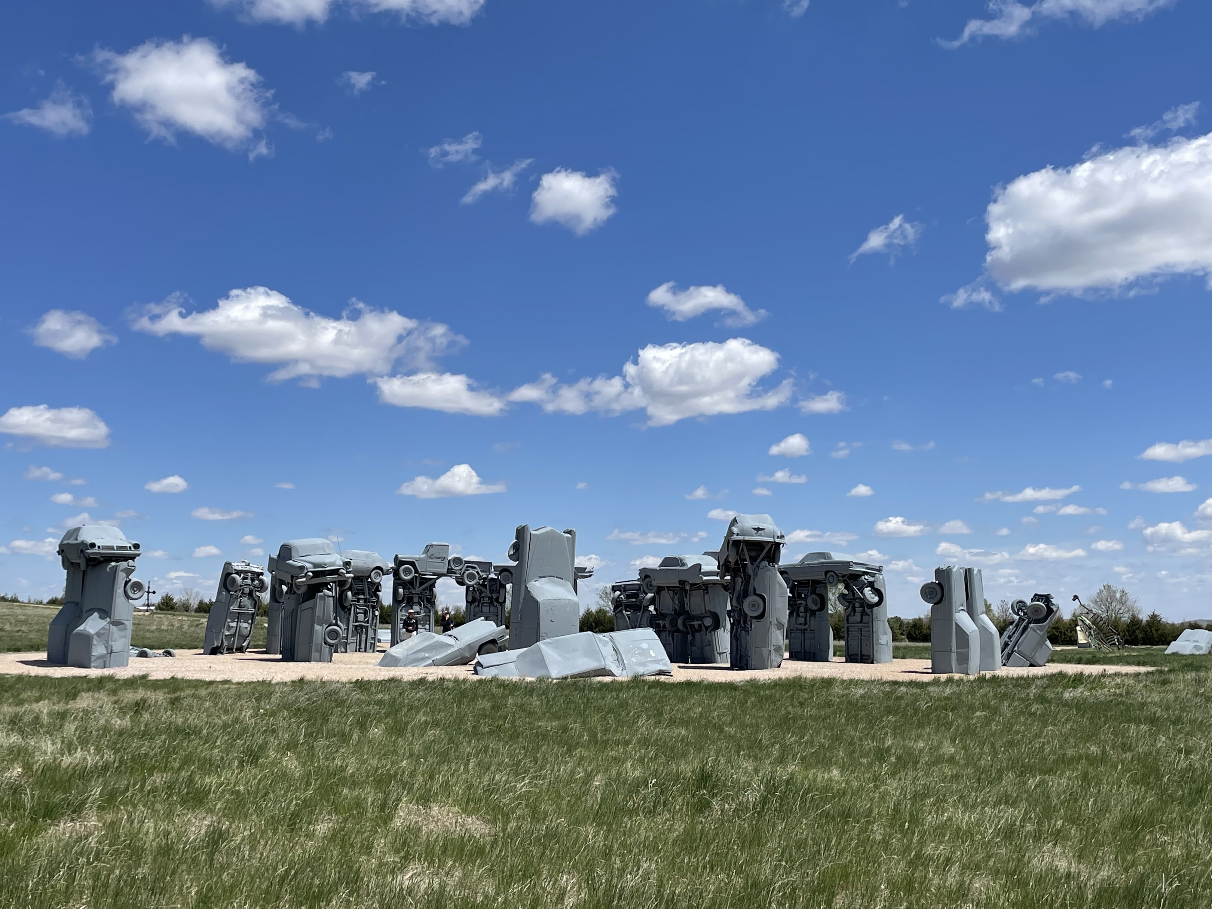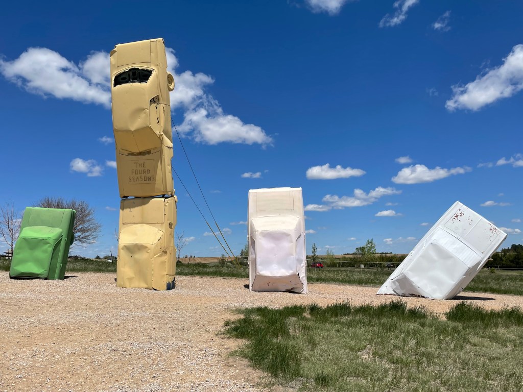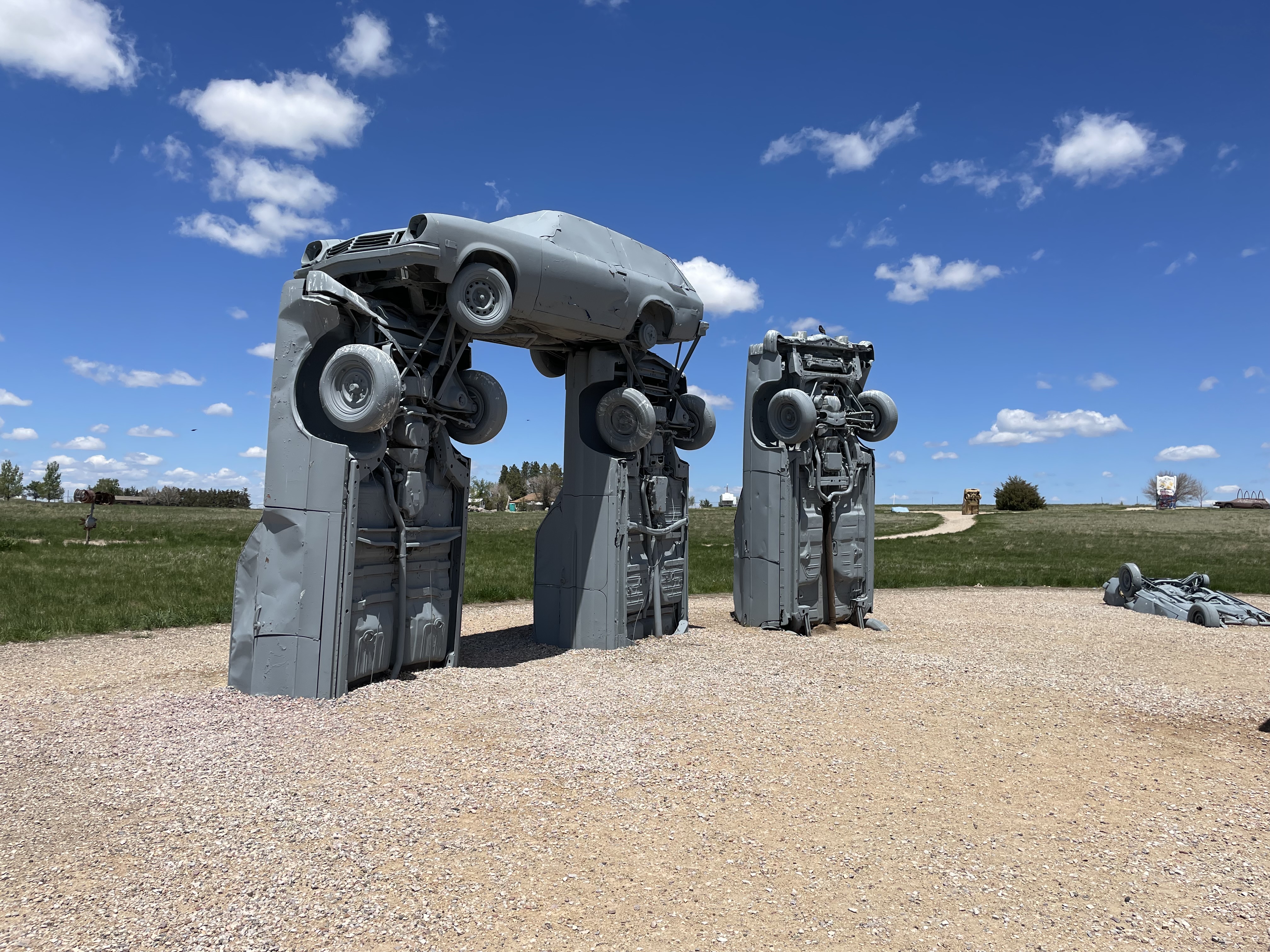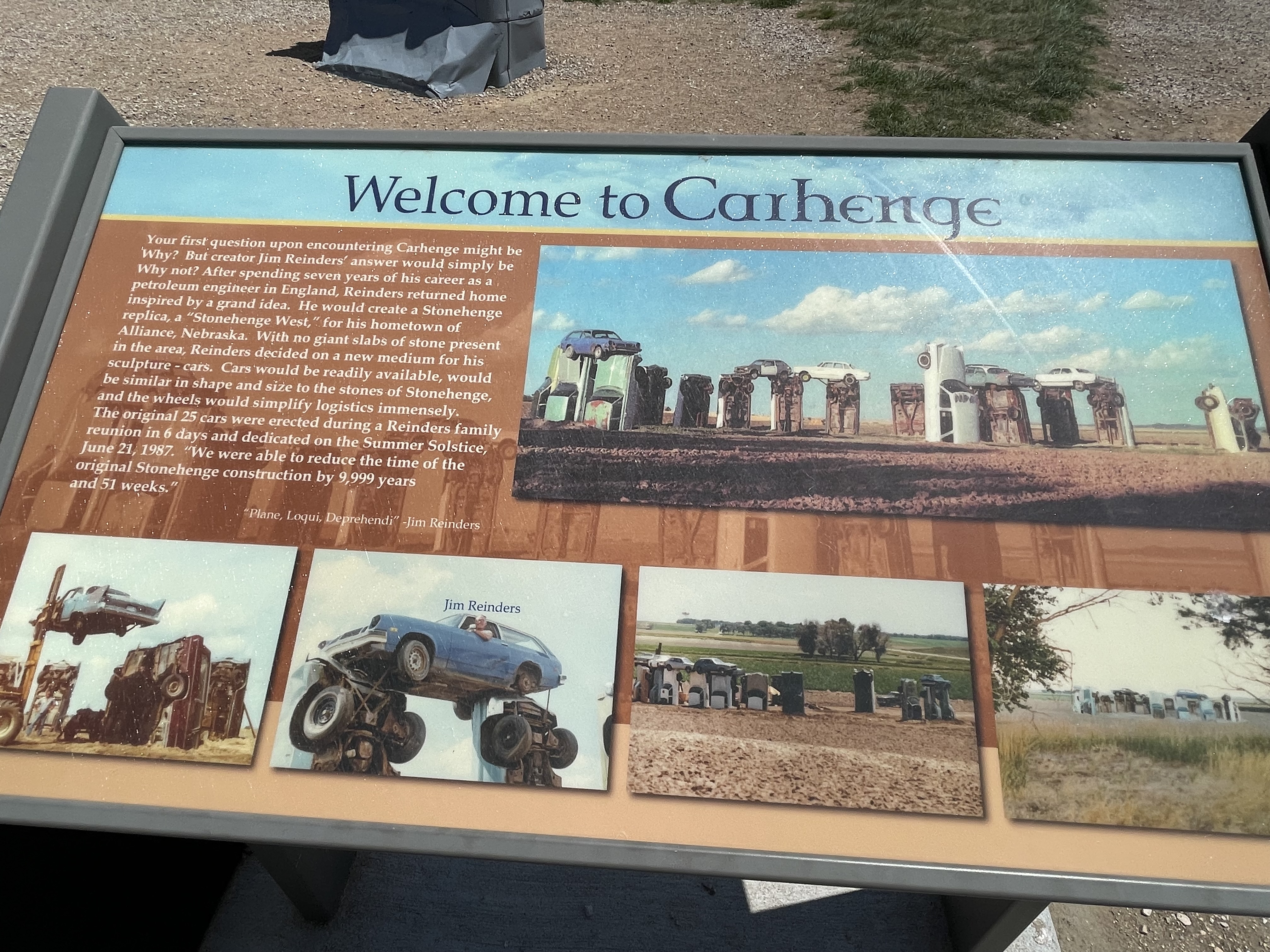 We bugged out of Rapid City wanting some flatter land to tow through, so we drifted south and east toward the promise of the Great Plains. Our target was Alliance Nebraska, where a colorful local by the name of Jim Reinders reproduced the ancient temple of Stonehenge using cars instead of rocks. It’s a to-scale model, with precisely placed elements matching the original complete with an eastward facing portal that directs rays of the sunrise onto a specific fender of a specific rusty hulk on a specific day, which is implied but not specified. That’s not important. What is important is WHY he did it. When asked, he answered “Why not?”. So, there, in a nutshell is what’s important today. This is what counts for excitement in Nebraska.