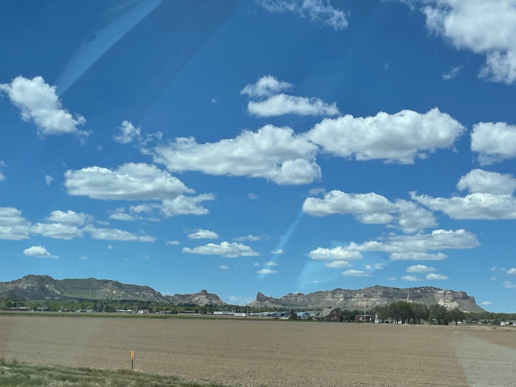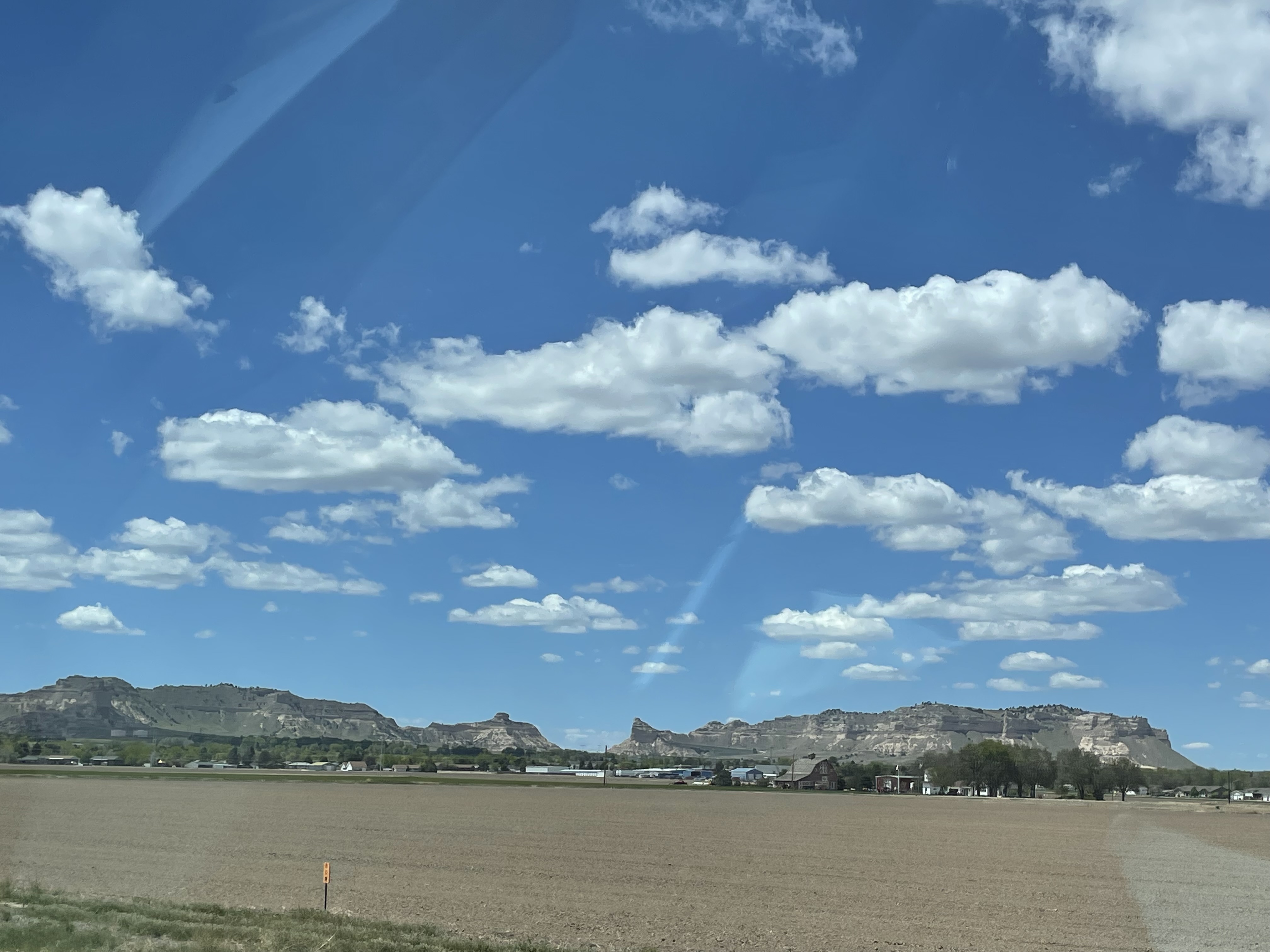 The remaining ride to Cheyenne was predictably flat until we turned west at Kimball and began a long 60-mile uphill grade toward the Rockies that consumed well over ½ tank of gas (estimated mileage about 6 mpg). You could practically hear my wallet screaming. We were rewarded, however, with some very stunning landscape views, like Scott’s Bluff, which just rises out of the flat plain.