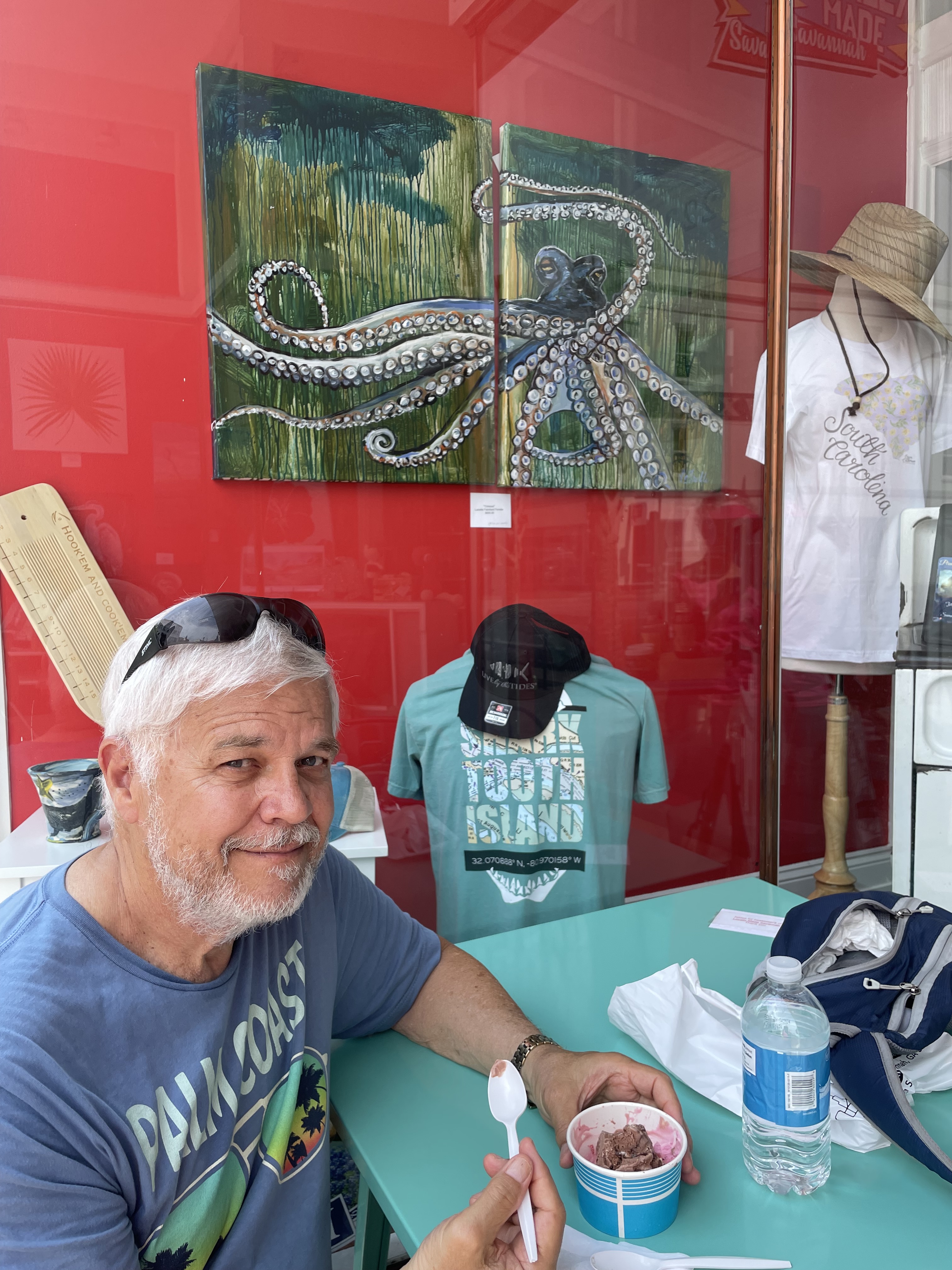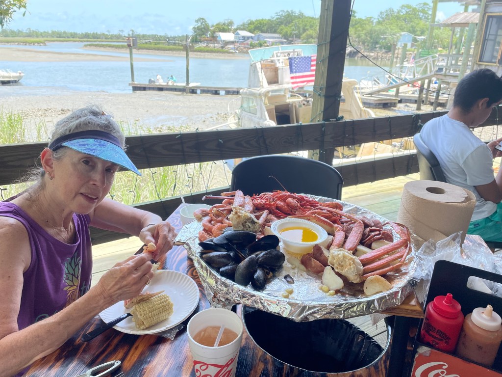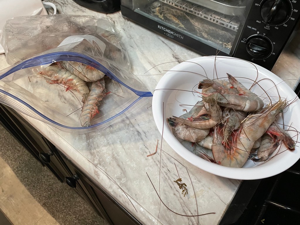 We also met Charlie the Shrimp King. Or rather, he met us. Charlie has a shrimping boat on Tybee Island just east of Savannah and sells his catch out of the back of his pickup truck. Our RV campground here, which is really a 200-acre farm with several businesses on it, is one of his favorite sales territories. He’s a “praise the lord” kind of guy. He sells big fat jumbo prawns that were wild caught. We bought a couple of pounds and made a very nice dinner out of half of them. The other half is in the freezer awaiting their future fate.