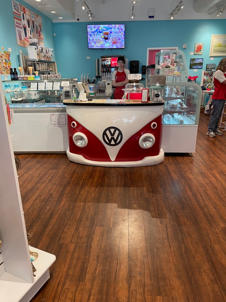 Did I mention that it was nearly 90 degrees at 10AM? When my internal thermometer starts to read a little high, I like to turn to ice cream as my preferred cooler. We found a small shop, Locally Made, that had not only very good ice cream, but the coolest counter I’ve seen yet.