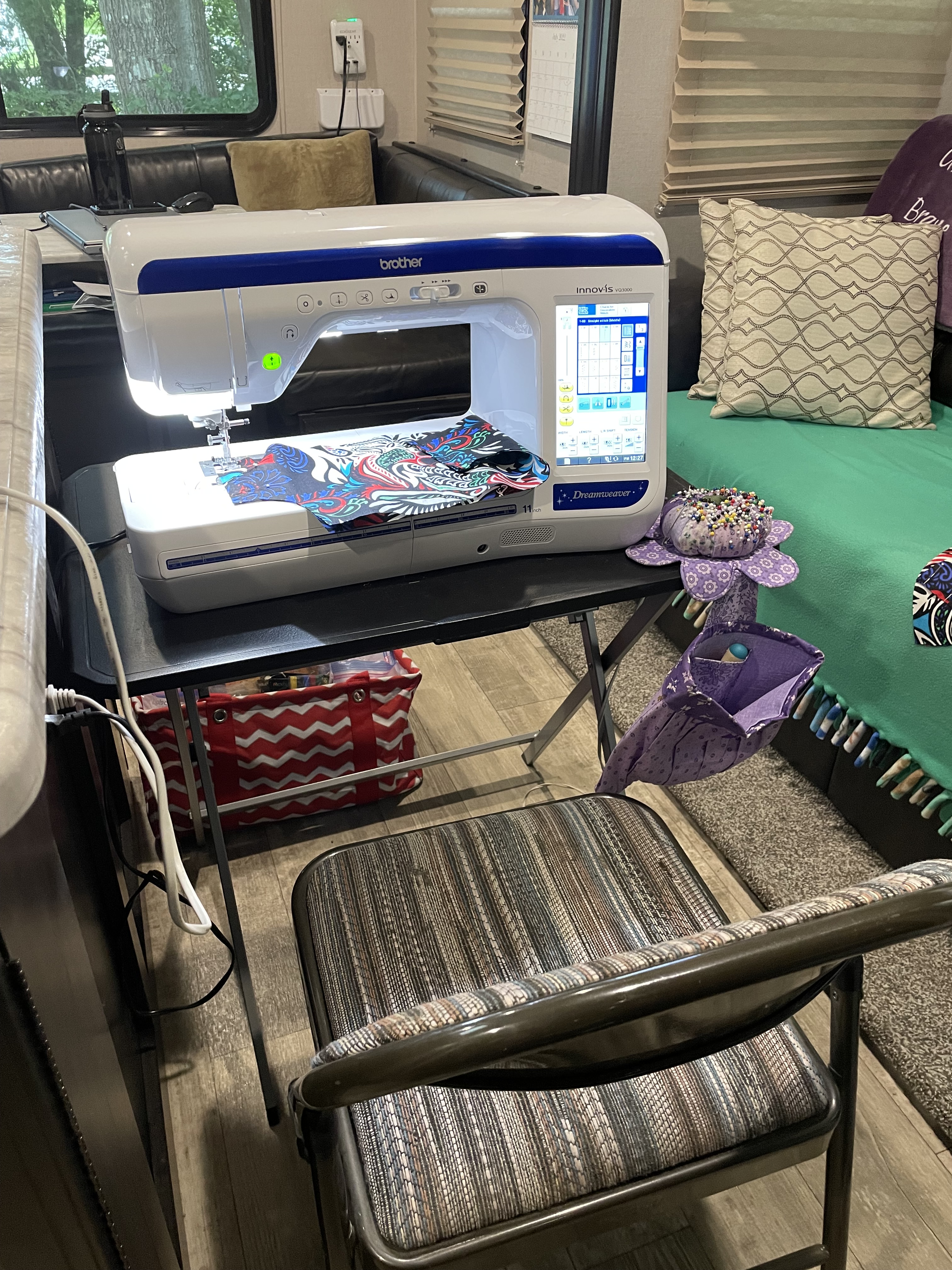 Within Warren’s theme of “a variety of things”, I couldn’t think of anything to write until I sat down at my sewing machine. My sewing machine is enormous and quite heavy. I didn’t want to pack it in the moving van because I was afraid it would get damaged, or worse, destroyed in the long journey. I found a place for it in the RV at the foot of the bed where it barely fit. After both of us banged our toes into it for the first couple of weeks, we finally started remembering it was there (see the previous reference to Pointy Things).