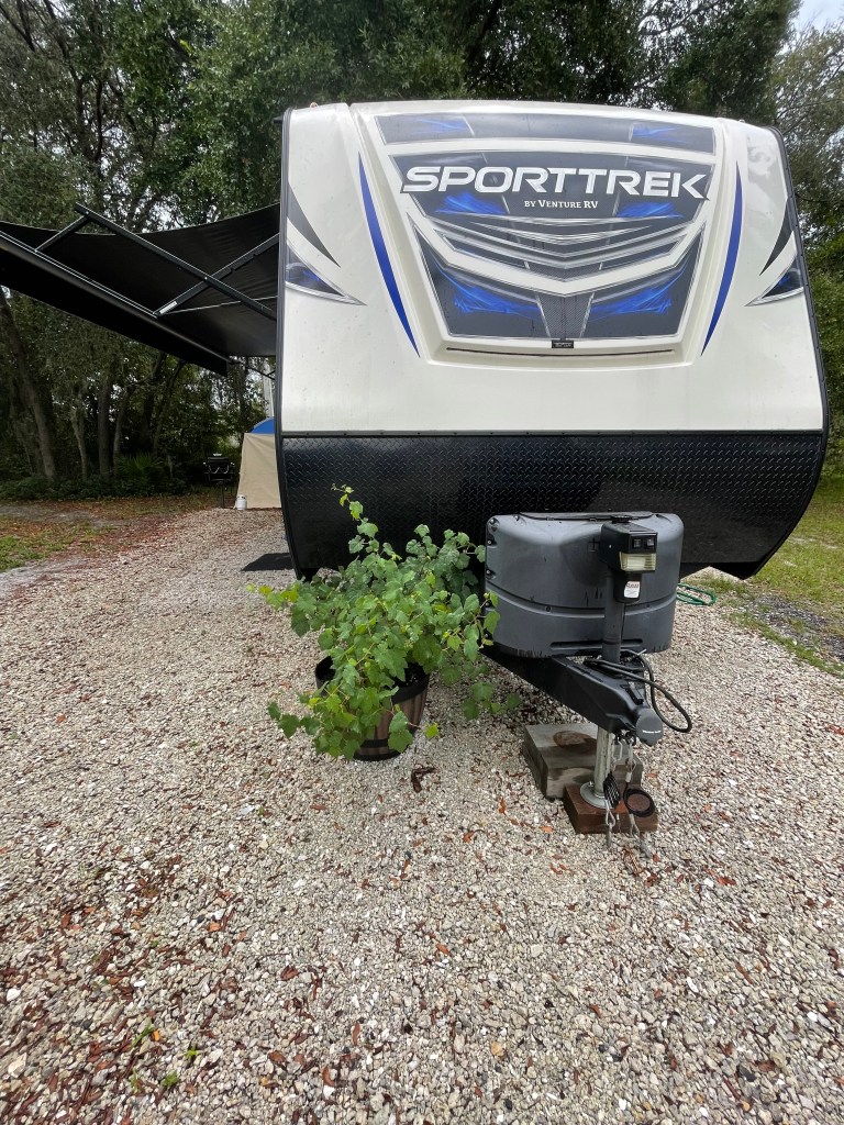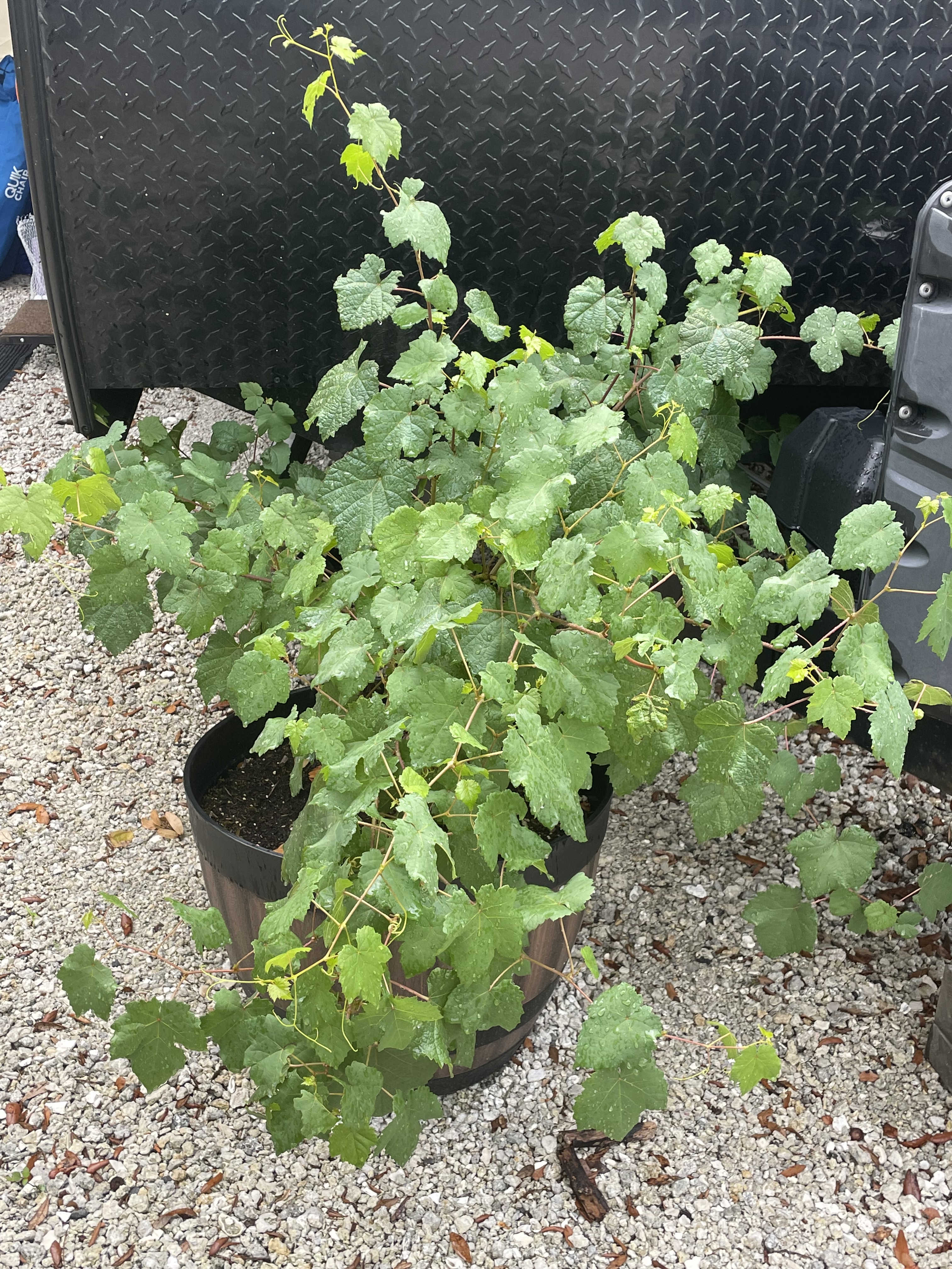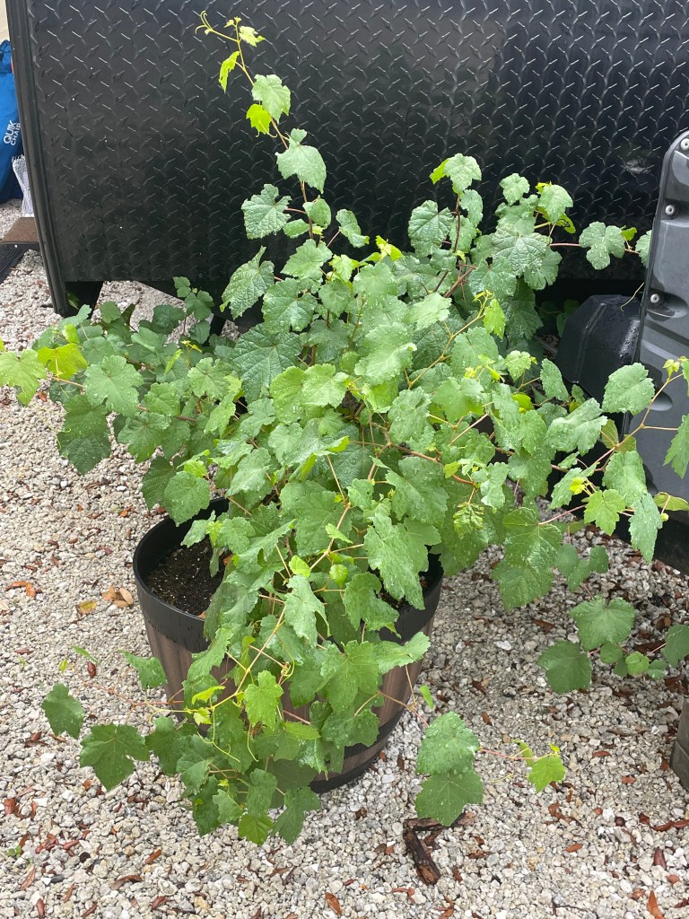 This year was a very cold and long spring in Washington, and the V stayed dormant much longer than ever before. By the time we left in mid-May, only a few small sprouts had emerged. Our weather and “climate” didn’t really improve until we headed south through Colorado, and that’s when the V woke up. By the time we got to our current camp, we had some 2-foot-long vines ready to spread their wings, and true to form the V has responded very vigorously to the super warm and humid days here. Our timing on the move into the new house might be perfect for our end game with the V. Our goal has always been to put this baby in some terra firma when we got a “forever home”, and a late winter planting will be perfect!